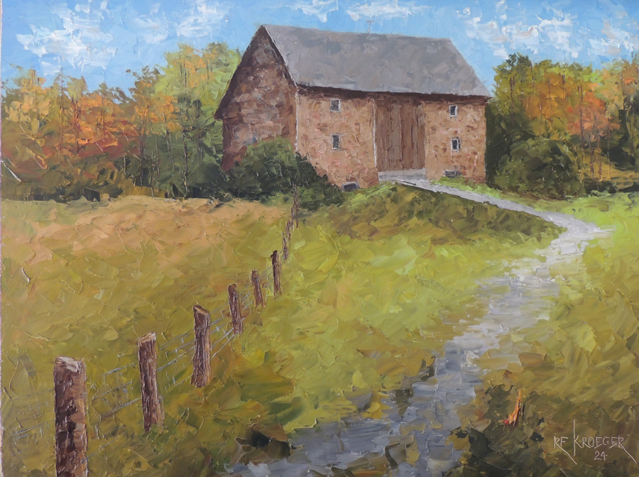 Loudon County, VA. 11x14". This handsome stone barn has deep roots, tracing from the MacGregor clans in Scotland to the British colony of Virginia. Thomas Gregg founded the Silver Linden Farm in 1744 and built this stone barn a year later, which makes it possibly the oldest existing stone barn in the country. His wife Hannah and he were farmers as were their three sons, Thomas, John, and William. They trace back originally to Scotland; Gregg is a derivation of Gregor and MacGregor. This painting can be seen at the Morgan County Historical Society, located in McConnelsville, Oh. Call with questions 740 962-4785