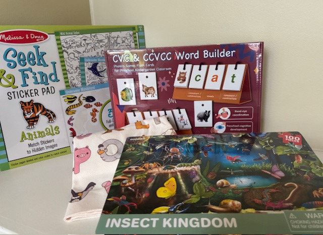 This basket was donated by the Staff at PCL - Thank you! Many Fun and Imaginative things to do - Jigsaw Puzzle - Animal Alphabet Canvas - Seek and Find Sticker Pad - Insect Kingdom Puzzle - Fishing Game - Pip-Squeaks Markers - Flashlight - Word Builder Game - 5 Fun Books - and a Tote Bag.