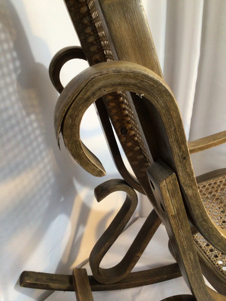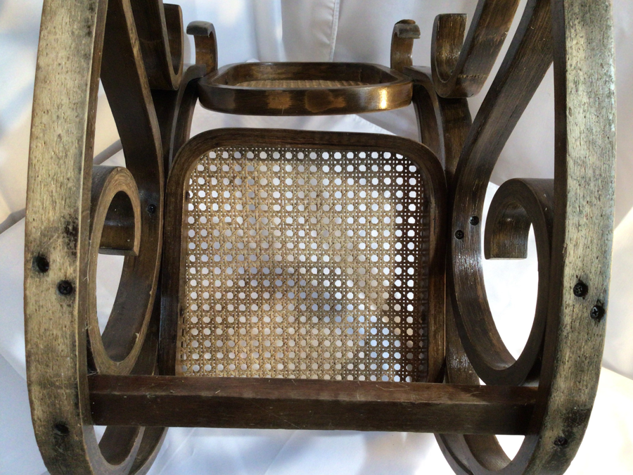 Caned seat and back. There is a loose piece of wood at the back right. There is a loosening of the wood curve at the back right. See the last photo. 13.5” x 26.25” x 27”