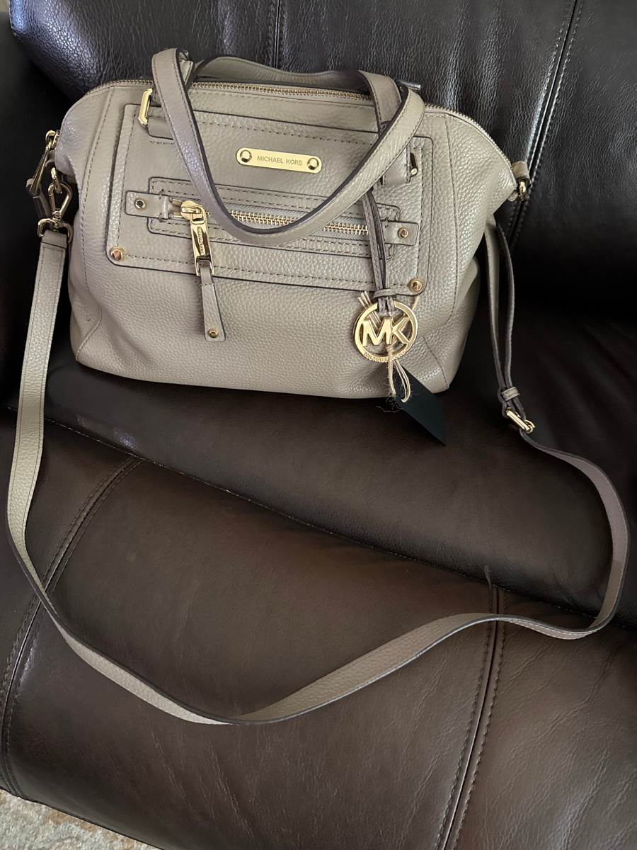 Michael Kors grey leather handbag with long strap + short. Several inside pockets and zippers. Chimps is a women`s fashion and accessories boutique located inside The Mercantile in Fort Worth. It offers a variety of clothing, jewelry, and accessories, with a focus on unique and one-of-a-kind pieces. The store is known for its diverse inventory, which includes various brands and items like sterling jewelry and scarves, catering to different styles and sizes.