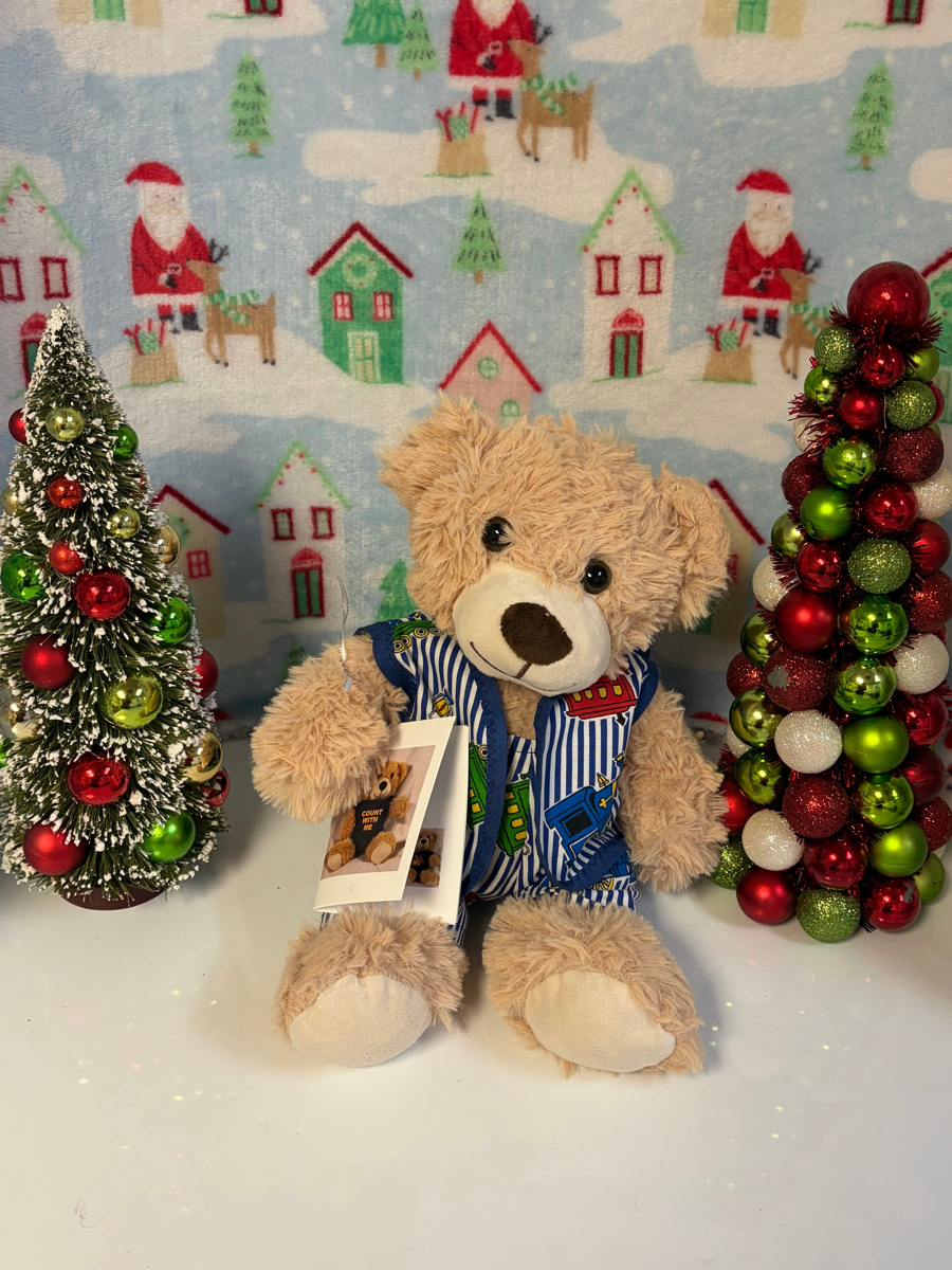 Choo-Choo Charlie is a lovingly handcrafted bear dressed in a charming striped train-conductor outfit decorated with colorful engines and railcars. With his soft tan fur, curious eyes, and playful spirit, Charlie brings the magic of childhood adventures, imagination, and endless “all aboard!” moments wherever he goes. He proudly carries his How to Count book, ready to help his new friend learn numbers with excitement, confidence, and fun — just like counting cars on a long, cheerful train. Whether he’s chugging along on pretend railway journeys, sitting beneath the Christmas tree, or offering warm bedtime cuddles, Choo-Choo Charlie fills every home with joy, wonder, and heart. Handmade with care, full steam ahead — Charlie is ready to meet his forever friend.