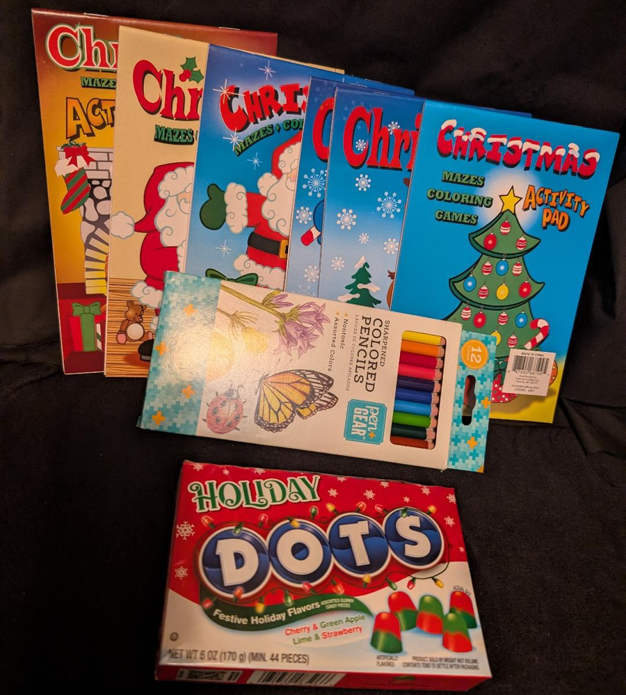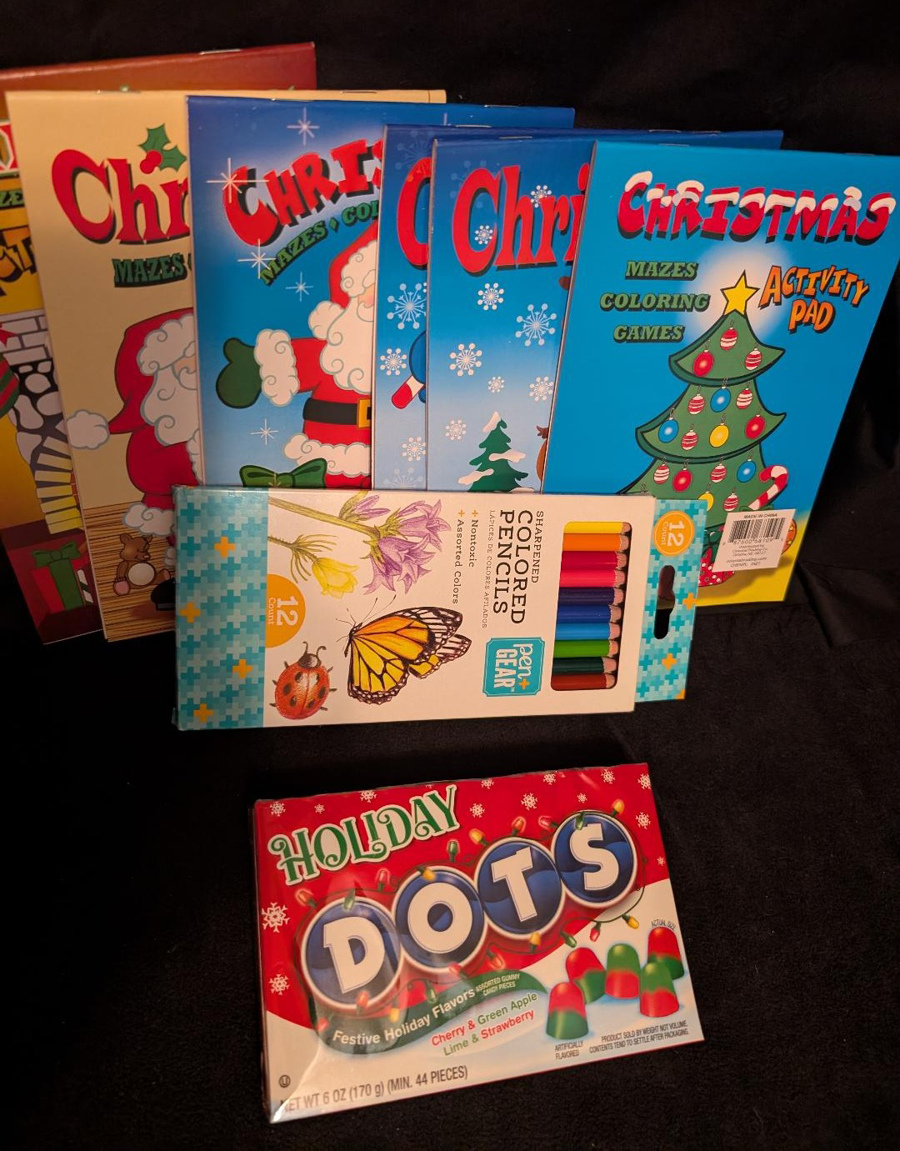 6 activity books to color, draw, word scramble, and more! Will keep the kiddo's busy while you are making supper or wrapping gifts. Also includes a box of colored pencils and a box of holiday DOTS.