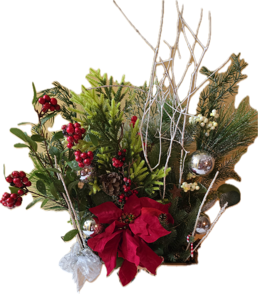 This exquisite Christmas arrangement serves as a stunning centerpiece that will light up your holiday celebrations. Featuring a harmonious blend of silver and white accents, this arrangement captures the essence of the season. The beautiful poinsettia blooms add a touch of festive elegance, making it the perfect addition to your Christmas décor. Whether placed on a dining table, mantel, or as a thoughtful gift, this centerpiece will surely bring joy and warmth to your home during the holidays. Don't miss the chance to elevate your Christmas spirit with this enchanting arrangement!