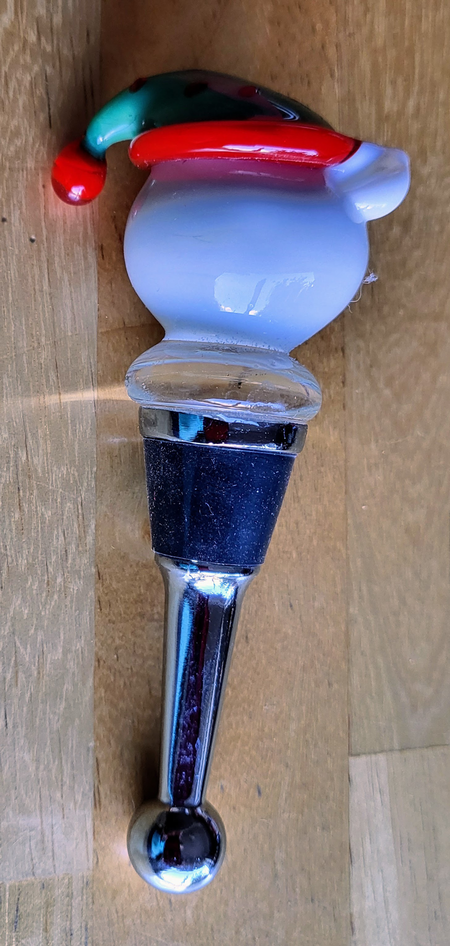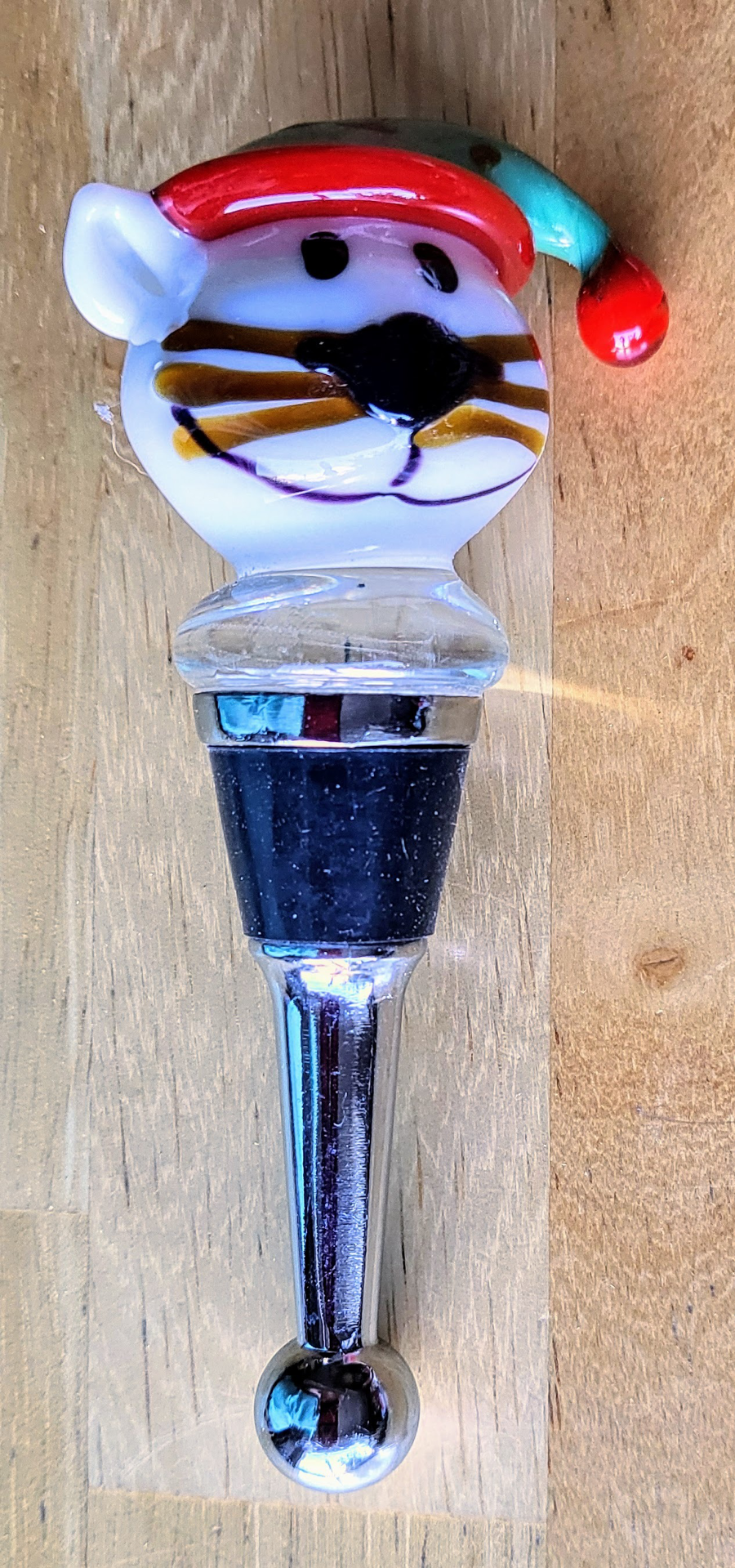 Keep your holiday wines fresh with the blown glass kitty in a Santa Hat! Lovely gift box. Stopper measures about 4" x 1.25"
