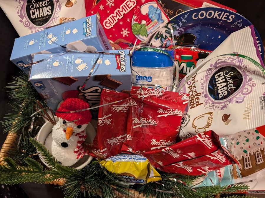 This is a fun basket. Has Night Before Christmas Hardbound Picture Book, a Cookies for Santa Plate, 2 Boxes of Hot Cocoa Mix, Marshmallows, 2 Hot Cocoa Mugs, Christmas Cookie Decorating Kit, Gingerbread House Decorating Kit, Assorted Holiday Candy & Cookies for the kiddo's to eat while sipping hot cocoa and reading The Night Before Christmas, Hot Cocoa Drizzled Popcorn, and a cute snowman ornament.