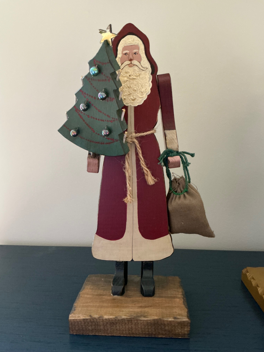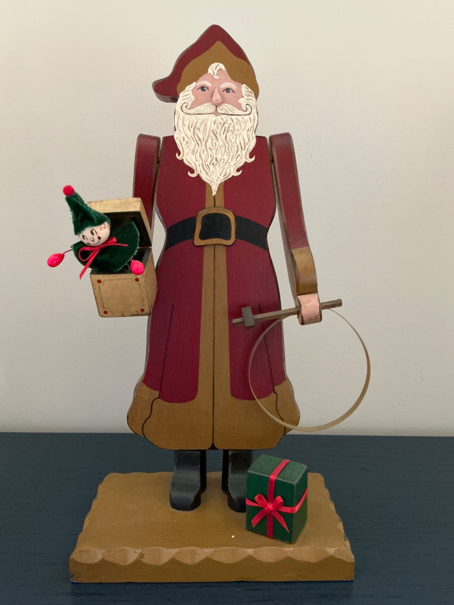 Christmas folk art collection signed by Barbara A Kissinger, Burlington, Iowa 1983, 1985, and 1987. More Santas are available for sale at the Thankful Arnold House Museum.