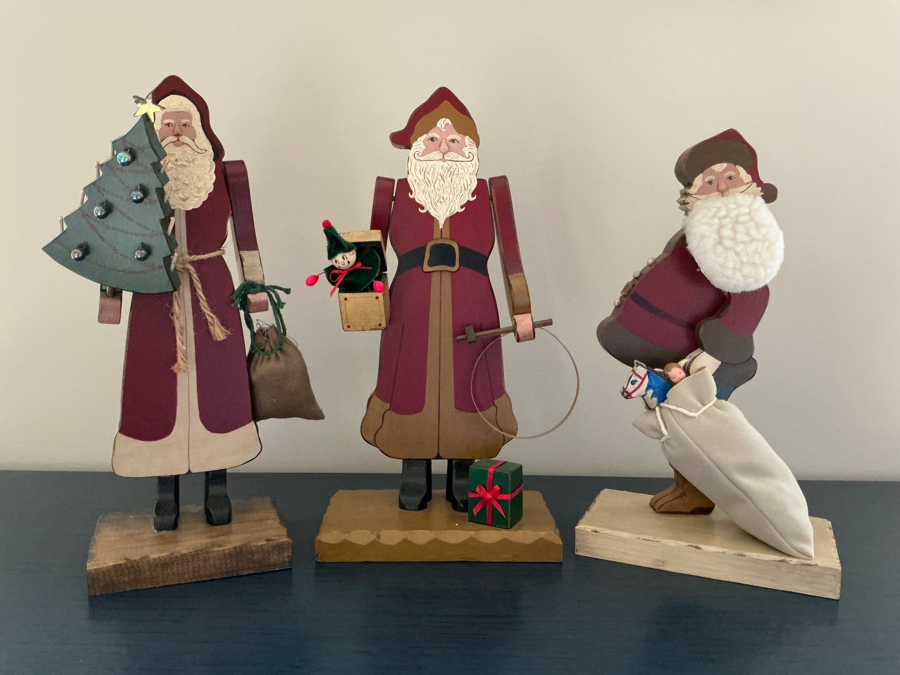 Christmas Folk Art Collection of 3 Rare Signed Barbara Kissinger Hand Carved & Painted Santas