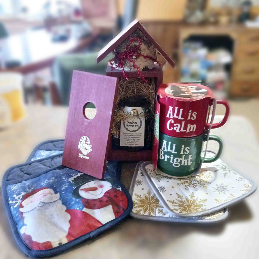 2 pack of Christmas Mugs, 2 pot holders, Bird house with simmering pot, and 3 pack of scented candles! A perfect addition to any Christmas day.