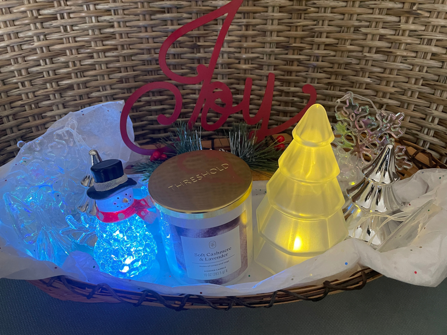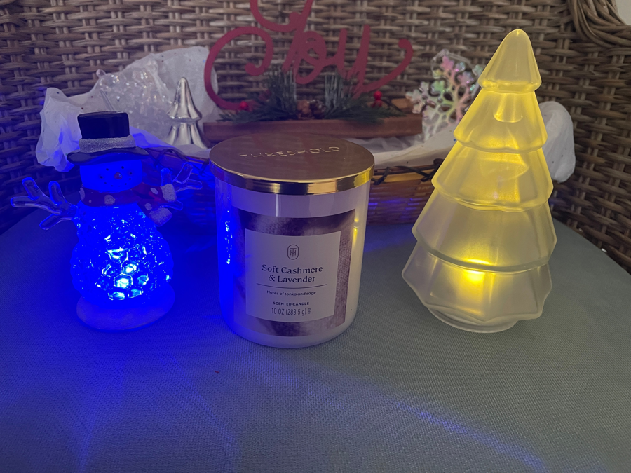 Light-up Christmas tree and snowman, four glass-look ornaments, two silver Christmas trees, lavender/cashmere candle, and some joy. Perfect for the holidays!