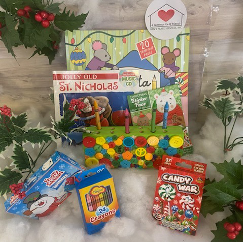 Keep your box of crayons in your green button design crayon holder made at Ben's Place. Your favorite kid will also get 3 assorted holiday books, a card game and some candy.