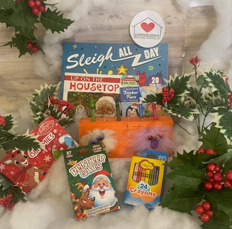 Keep your box of crayons in your orange silly monsters crayon holder made at Ben's Place. Your favorite kid will also get 3 assorted holiday books, a card game and some candy.