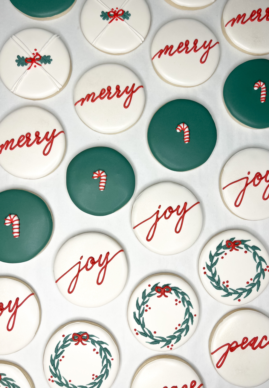 A variety of 2 dozen artificial dye-free Christmas sugar cookies. Will not be exactly as pictured but very similar.