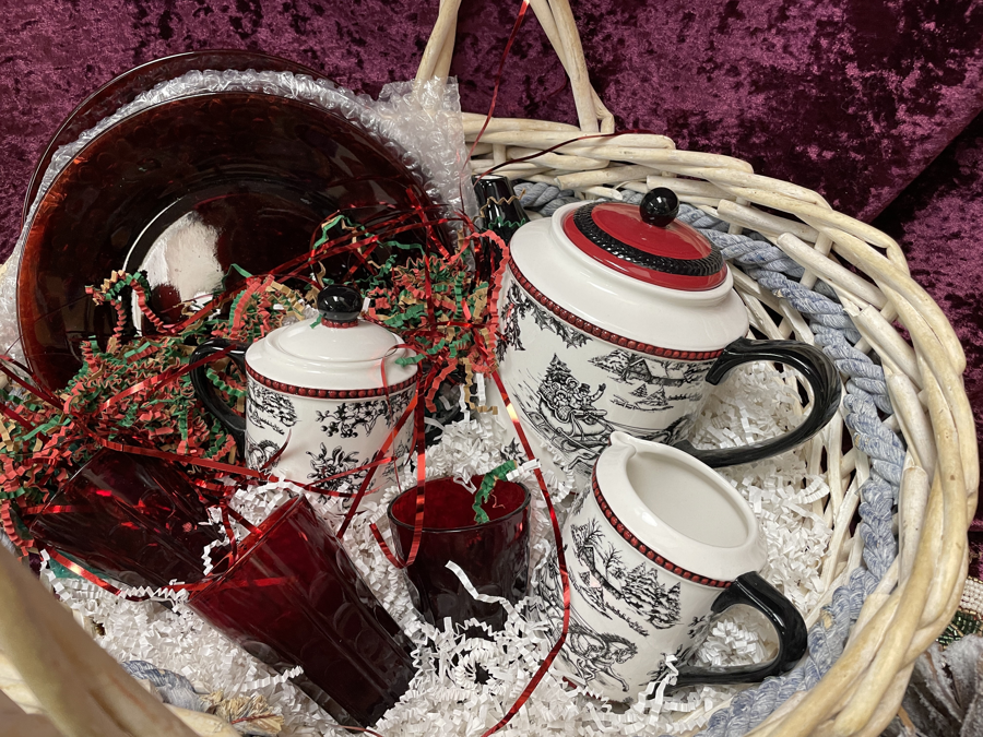 #1022 - Celebrate the holidays with this charming vintage collection. Features a festive teaset — including teapot, creamer, and sugar bowl — in a classic black-and-white Christmas pattern trimmed in red, paired with four deep red dessert plates (depression glass) and three matching small glasses. Perfect for seasonal entertaining or adding a touch of nostalgic holiday charm to your table. Gently used / Not redeemable for cash.