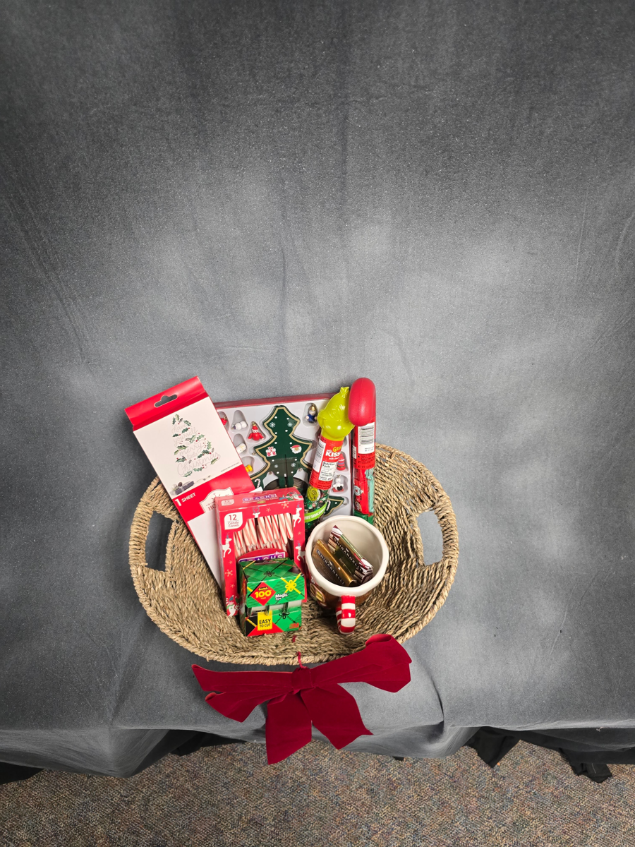 Do you need a basket for the holidays? This basket contains: A coffee mug Mini Christmas tree Christmas stickers Kit Kats Hershey Kisses Ghirardelli Carmel and Peppermint Chocolates