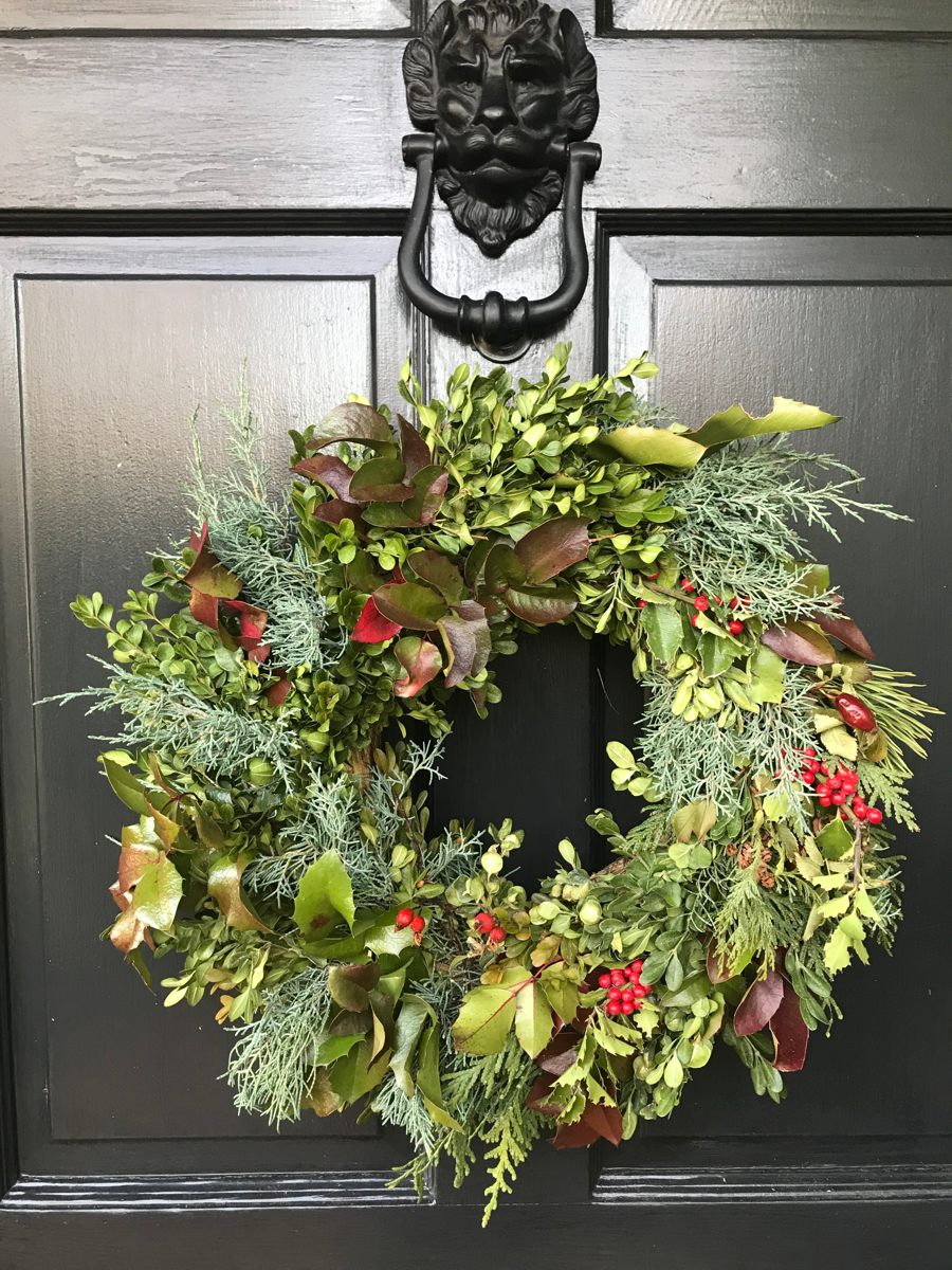 This Christmas wreath is hand made from local garden greenery. It is a unique and absolutely beautiful piece of winter art for your front door (or wherever you choose to hang it).