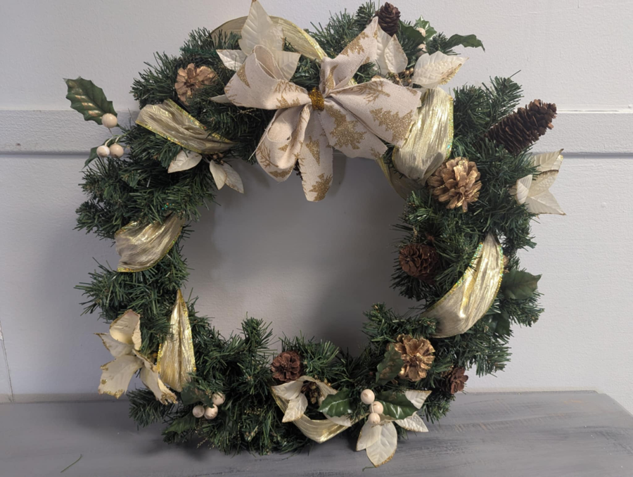 19" artificial Christmas wreath with white cranberries, gold ribbons and pinecones as embellishments.