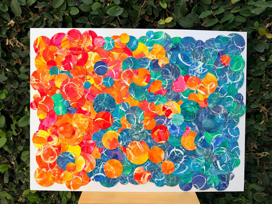 Bid on this cheerful, dynamic piece, "Chromatic Overlap," created by Ms. Banach's talented Fourth Grade Class! This vibrant artwork captures the collaboration and energy of the whole class. Each layer features bold, overlapping circles of color—vibrant blues, greens, yellows, and reds—resulting in a brilliant texture and an eye-catching focal point. This is truly a unique piece of abstract art to brighten any space. Specifications: • Medium: Painted Paper Collage • Artists: Ms. Banach's 4th Grade Class • Dimensions: 18"x24" This piece will be delivered to the buyer framed. Thank you to Newcomb's Art Teacher, Mrs. Romero, for her collaboration with the Newcomb Academy Foundation to produce this work of art.