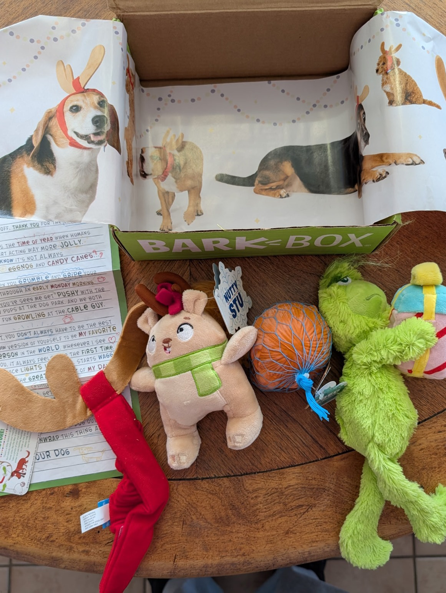 Get ready for a festive treat with our Christmas Bark Box! This delightful package features a variety of fun items, including a playful Grinch toy, a ball, a cute pig plush, and a stylish Max antler head scarf for your dog. Perfect for spreading holiday cheer, this Bark Box is designed to keep your furry friends entertained and stylish during the Christmas season. Don’t miss out on this whimsical collection that captures the spirit of the holidays!