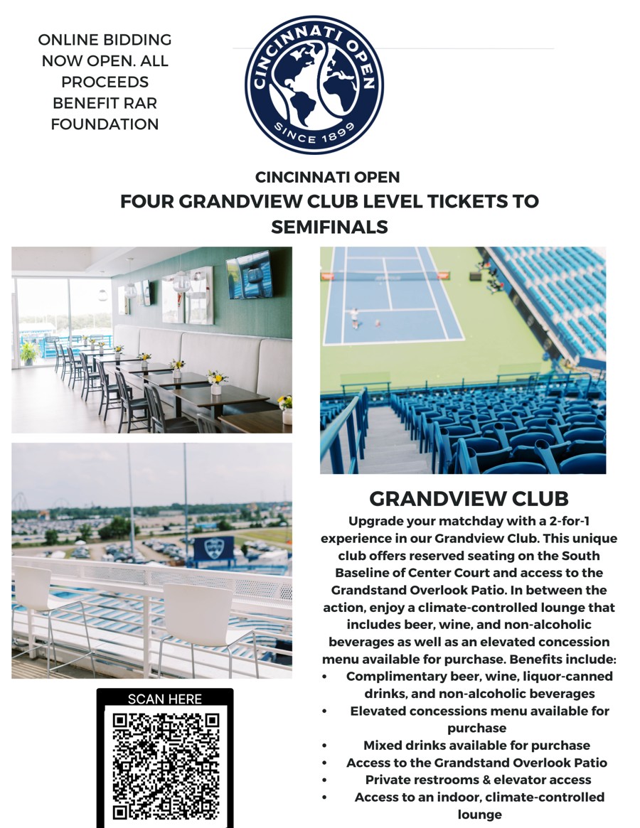 The Cincinnati Open is proud to donate two (2) Grandview Club level tickets for the finals, Sunday, August 23, 2026 season (sessions/details TBD), to the USTA Kentucky organization in presenting its event. The session tickets include access to the Grandview Club, a private club area inclusive of beer, wine and soft drinks. There is a private concession area where food may be purchased, and a cash bar for cocktails. The 2026 tournament will be conducted from August 11-23 at the Lindner Family Tennis Center in Mason, Ohio. Visit www.cincinnatiopen.com for more details. The recipient of this certificate will receive tickets directly from a contact at the USTA Kentucky organization. All tournament tickets are mobile.