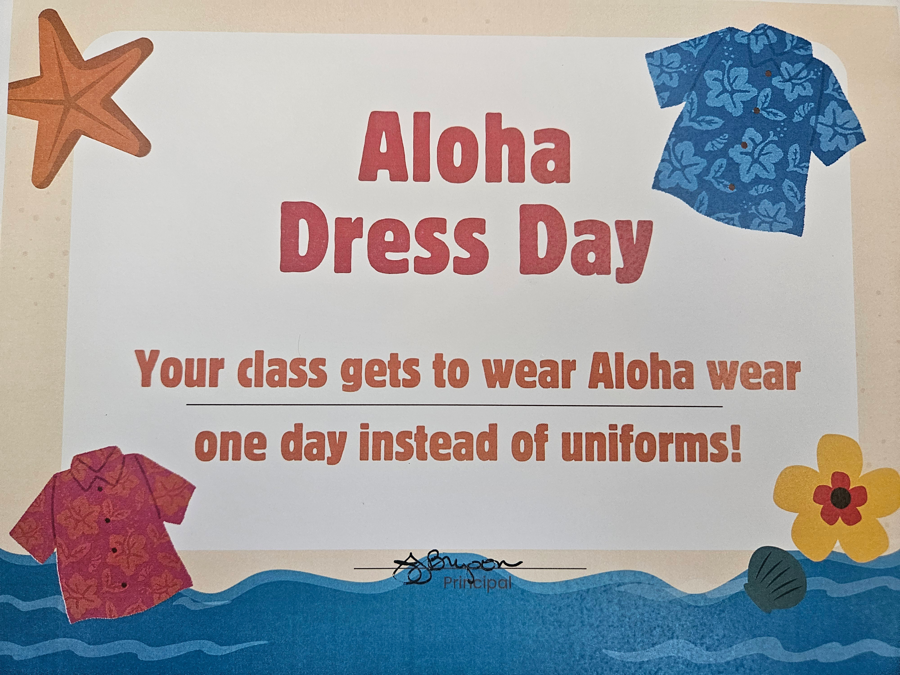 Good for one non-uniform Aloha themed dress down day for your entire class. Teacher must approve the chosen date. Non-uniform clothing must be school appropriate.