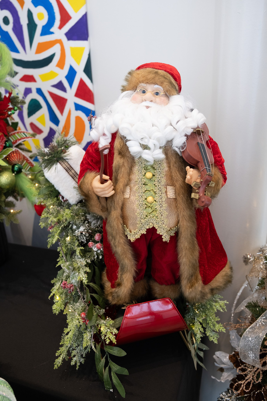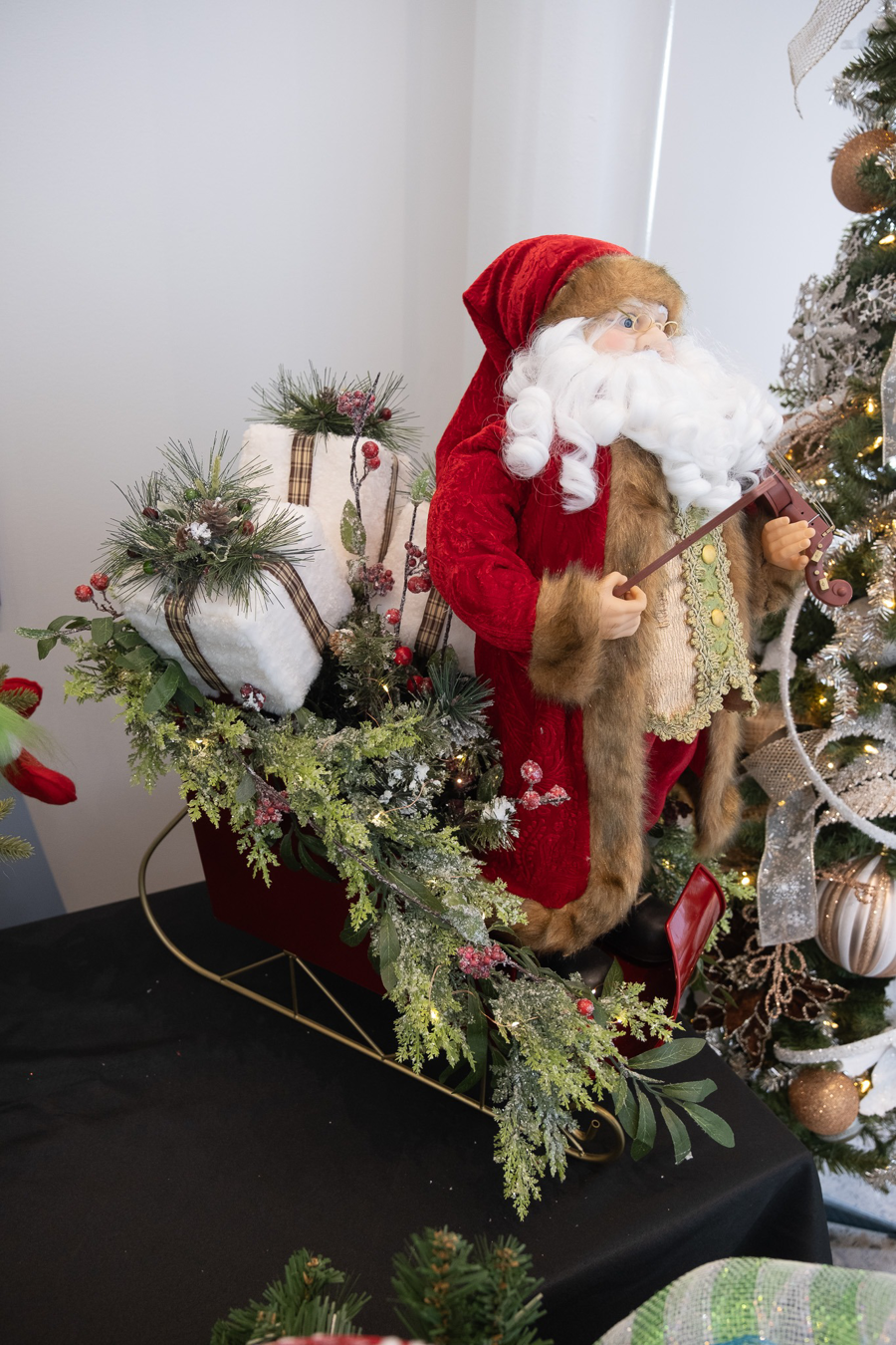 You just can't beat the holiday classics. This centerpiece features an ornate Santa Claus dressed in an elaborate red coat with rich textures, including faux fur trim and a gold-embroidered vest accented with large decorative buttons. His white hair and round glasses give him a classic, cheerful appearance as he stands upon his sleigh containing gifts and decorated with wintry greenery and berries. In his hands, he holds a small violin and bow. *Measures 22" wide x 29" tall