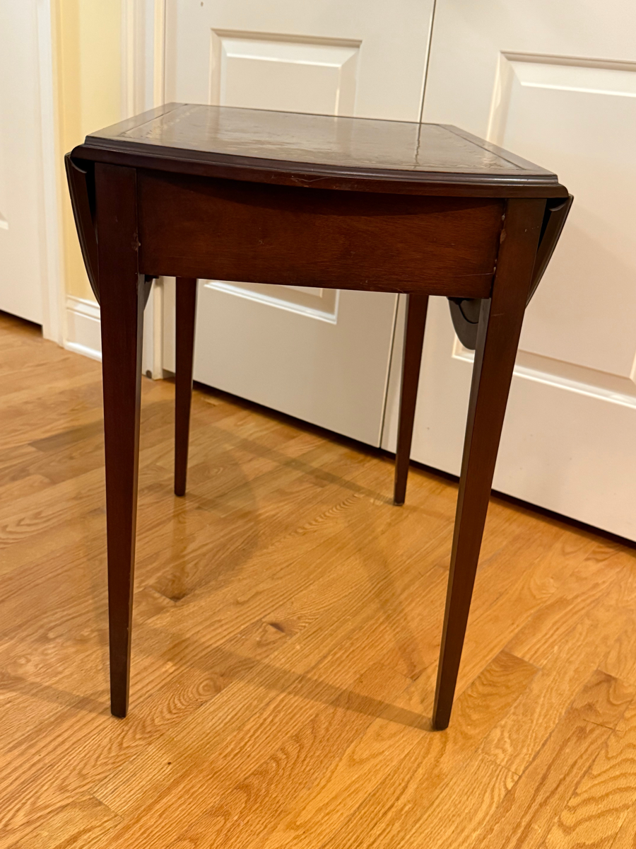 This vintage 1940's one-drawer table will bring new life to your decor. It has urn inlays, a leather top with gold accents, and two fold down leaves. This versatile piece is perfect for your living room, bedroom, or den. It measures about 25" tall, 18" wide and 26" deep. When the leaves are opened up, the oval surface is about 34" wide. Tea anyone? The table is in overall excellent condition with just a few small nicks that do not distract. Winning bidder will arrange pickup at church.