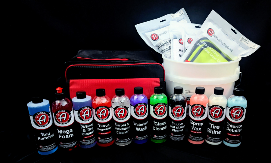 Adams Polishes Car Care Kit: (Bucket, storage bag, wash mitt, plush towel, glass towel, drying towel and 11 different cleaners).