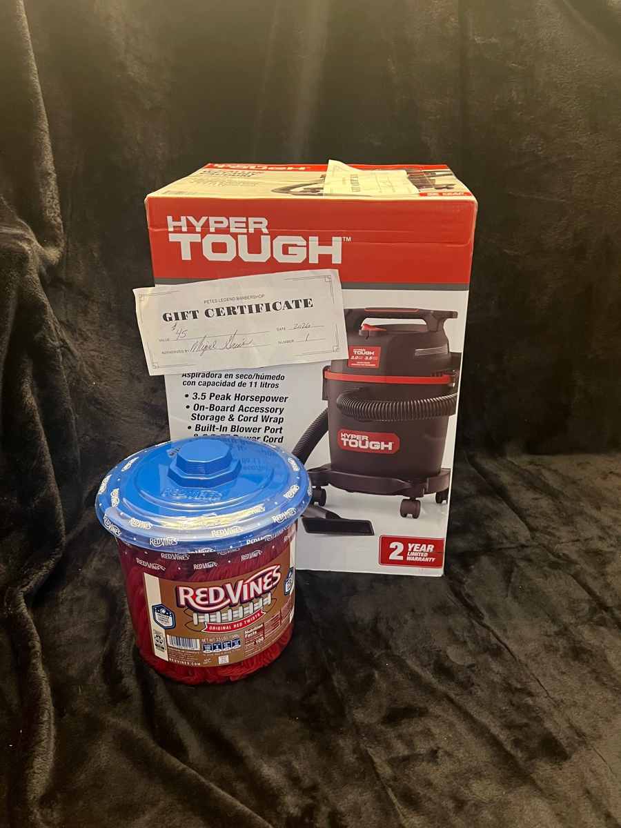 3 Gallon Shop Vac, Licorice Tub, and (2) $45 Gift Certificates to Pete's Legend Barbershop