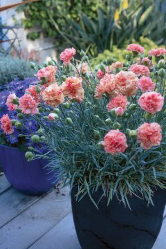 Dianthus "Orange Sparkler" is a vigorous, clumping perennial. Highly scented double flowers with warm orange hues and sparkles of hot pink flecks are held above fine silvery-blue foliage on sturdy, upright stems. Starts blooming early in the summer and repeats into fall. The compact form is fabulous for containers or lining garden paths.