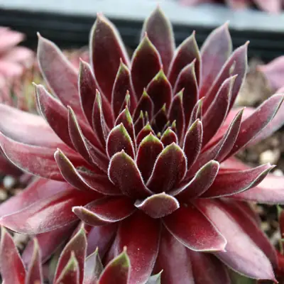 Sempervivum 'Fuego' is an extra large, smooth succulent displaying red leaves with green tips. This cultivar produces fewer offsets than other Sempervivum and grows best in well-drained, gravelly soil that is not wet in winter, requires little water once established. With their architectural form and versatility, hens & chicks can thrive in unusual places, like the nooks and crannies of dry stone walls or rock gardens. When planted en masse in small spaces, they create an attractive ground cover. They also make beautiful indoor or outdoor container plants. They are adaptable, cold hardy plants that require minimal maintenance and can grow almost anywhere. They prefer sunny locations but can benefit from some light shade, especially in hot summer climates, can tolerate drought and resist pests, disease, deer, and rabbits. About the only thing that can harm these hardy plants is excessive moisture.