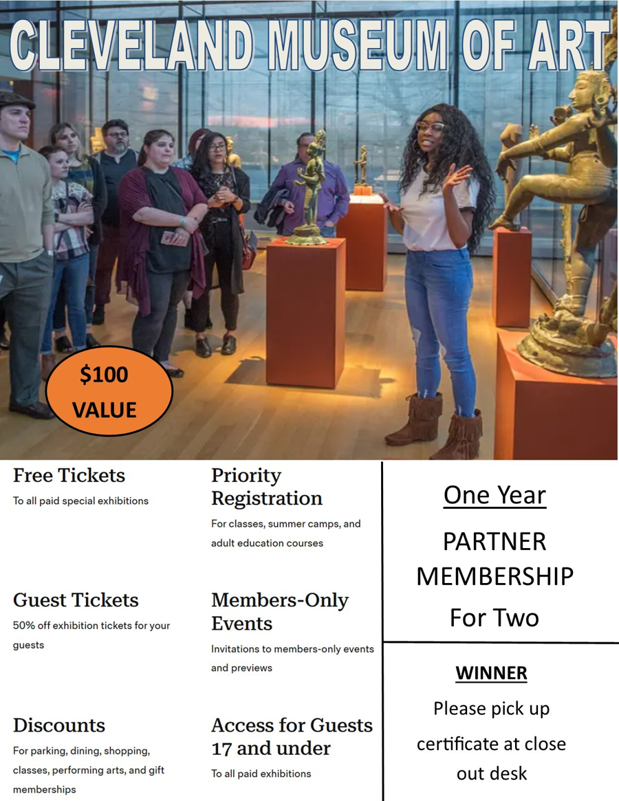 Cleveland Museum of Art – One-Year Partner Level Membership Enjoy a full year of art, culture, and inspiration with a Partner Level Membership to the world-renowned Cleveland Museum of Art. This exclusive membership includes: 🎨 Free admission to all special exhibitions and member-only previews 🖼️ Invitations to exclusive events, lectures, and programs 🛍️ Discounts at the museum store and café 🎟️ Reciprocal admission benefits at hundreds of museums nationwide through the North American Reciprocal Museum program Immerse yourself in one of the nation’s premier art institutions and experience the joy of supporting the arts all year long. Perfect for art lovers, collectors, or anyone who appreciates creativity and culture! WINNER - Please pick up certificate at the close out desk