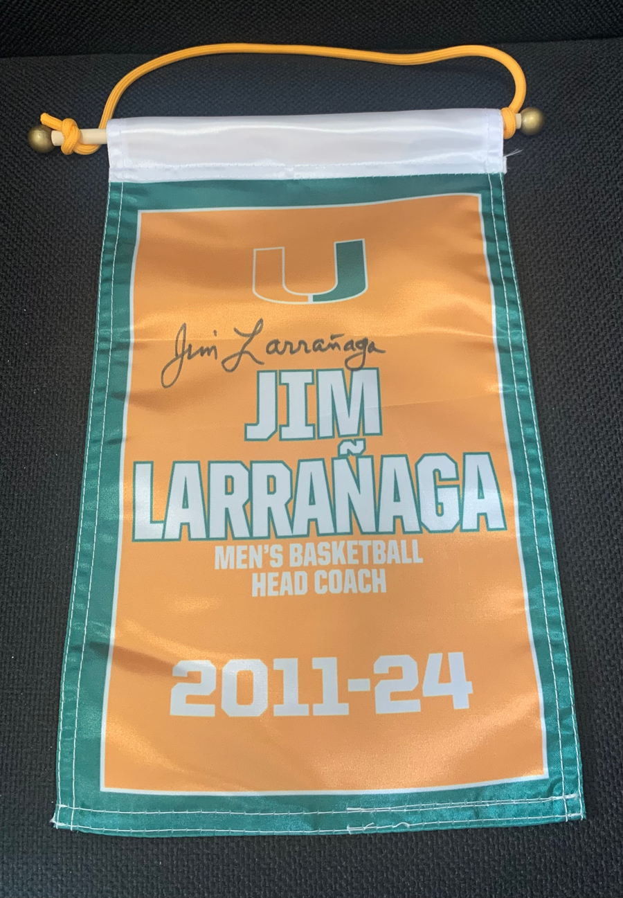 You can own this awesome, signed replica of the banner hanging in the Watsco Center to honor the career of former Canes basketball Coach Jim Larranaga! Coach L signed this at the 16th Annual UMSHoF&M Celebrity Bowling Tournament! It measures approximately 8 1/2 by 13 inches with the rope at the top to hang it on the wall in Canes Cave!