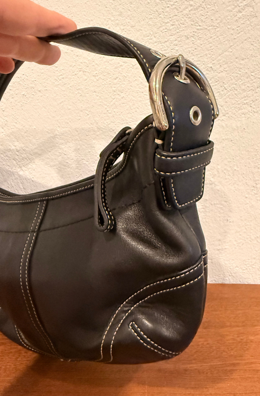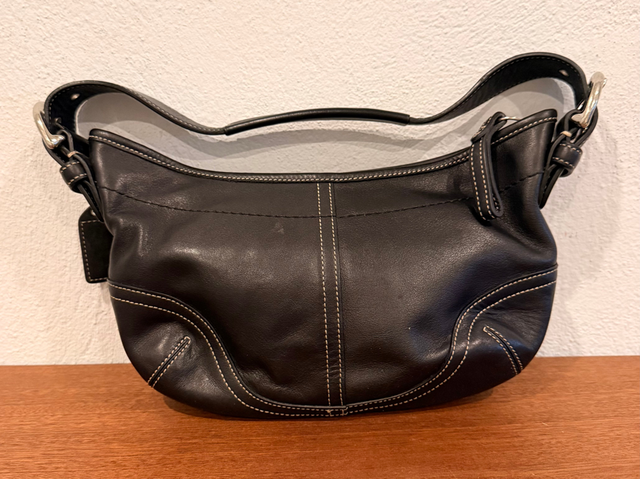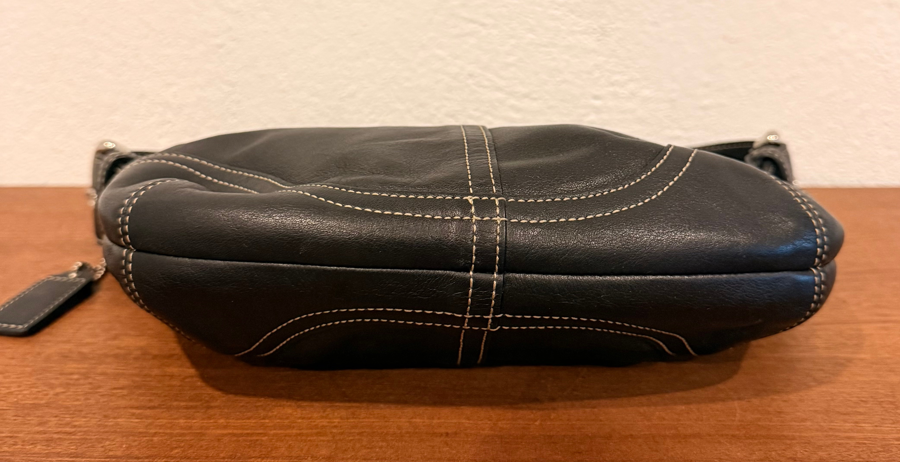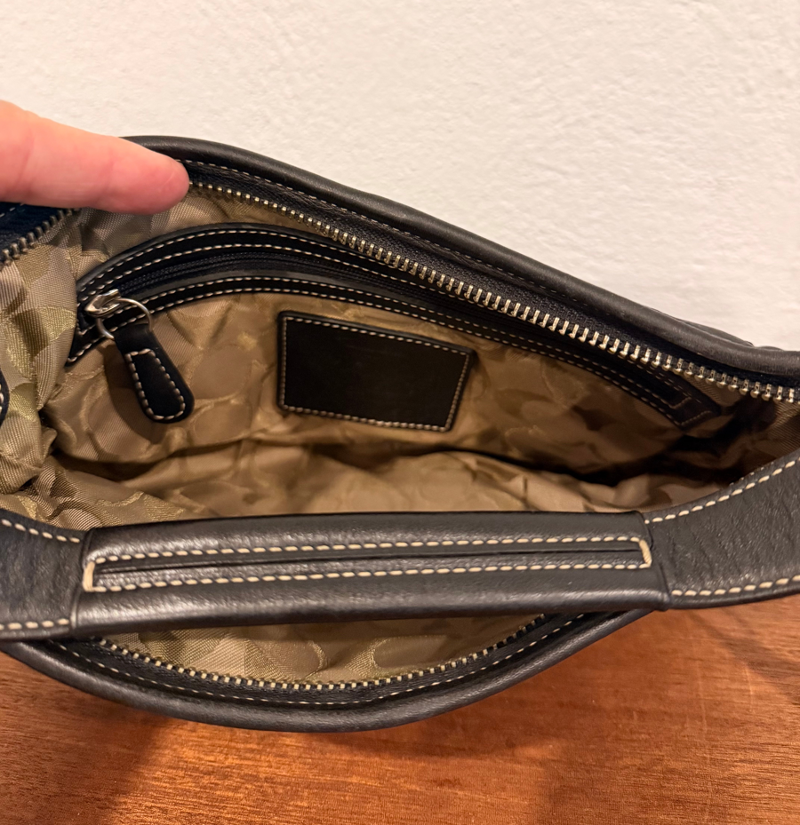 This is a Coach Hobo Leather 9541 black Shoulder bag, classic for Y2KCoach 9000 series (9541) bags which were produced in the late 1990s to early 2000s, aligning with Y2K era styling. The black leather contrasts with the white stitching and added silver-toned hardware are part of this classic look. The interior has the Coach “C” monograming and a zipper pocket. The bag is in excellent condition with no exterior scuffs or staining on the interior.