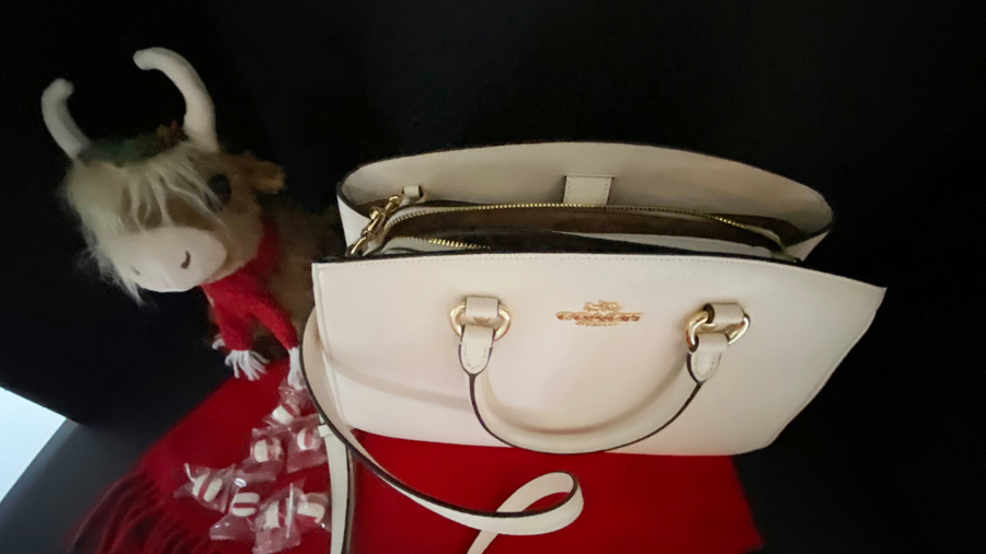 COACH Winter White Handbag, Highland Cow Tumi Alpaca Scarf