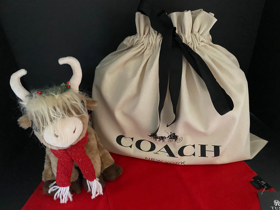 COACH handbag with short handles as well as an over shoulder strap, zip pouch inside as well as a magnetic closure tab; Tumi Alpaca Scarf and Highland Cow just to round out your gift and make you smile. Chocolates always bring smiles as well. Donor will ship item directly to winning bidder for free.