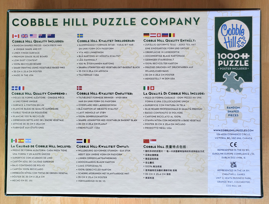 "Tea Tin Treasures" assembles to 19.25" x 26.625" and includes a poster of the image to guide you. Printed on recycled cardboard, puzzle has been very gently used.