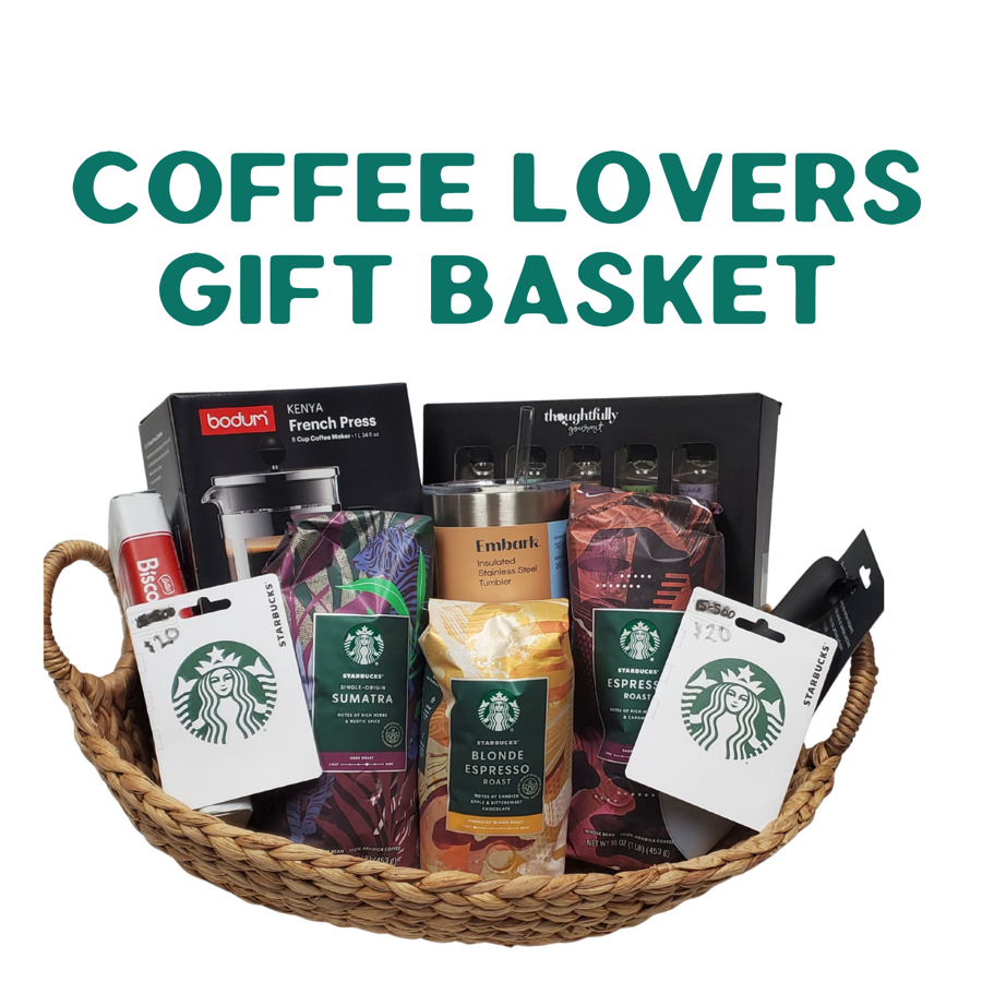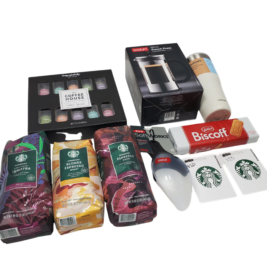 The winning bidder of this item will take home the Coffee Lovers basket filled with 3lbs of Starbucks Coffee, a French Press, assorted coffee syrups, a flexible scoop, a box of Biscoff, an insulated tumbler, and $40 to spend at Starbucks.