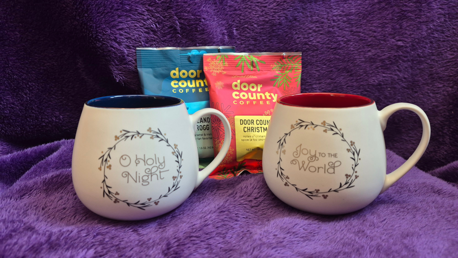 Get in the holiday spirit with 2 coffee mugs and 2 Door County coffee samplers (Door County Christmas & Highlander Grogg).