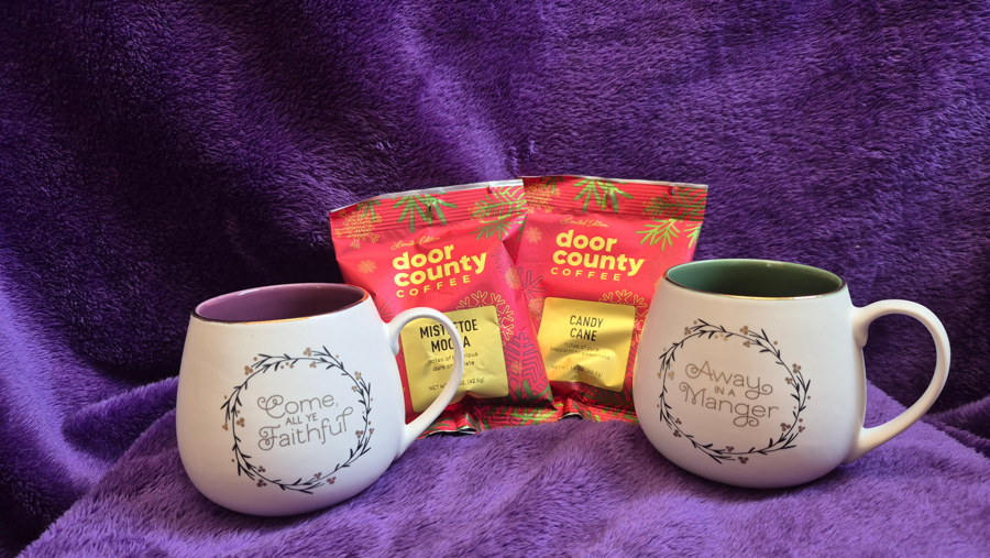 Get in the holiday spirit with 2 coffee mugs and 2 Door County coffee samplers (Mistletoe Mocha & Candy Cane).
