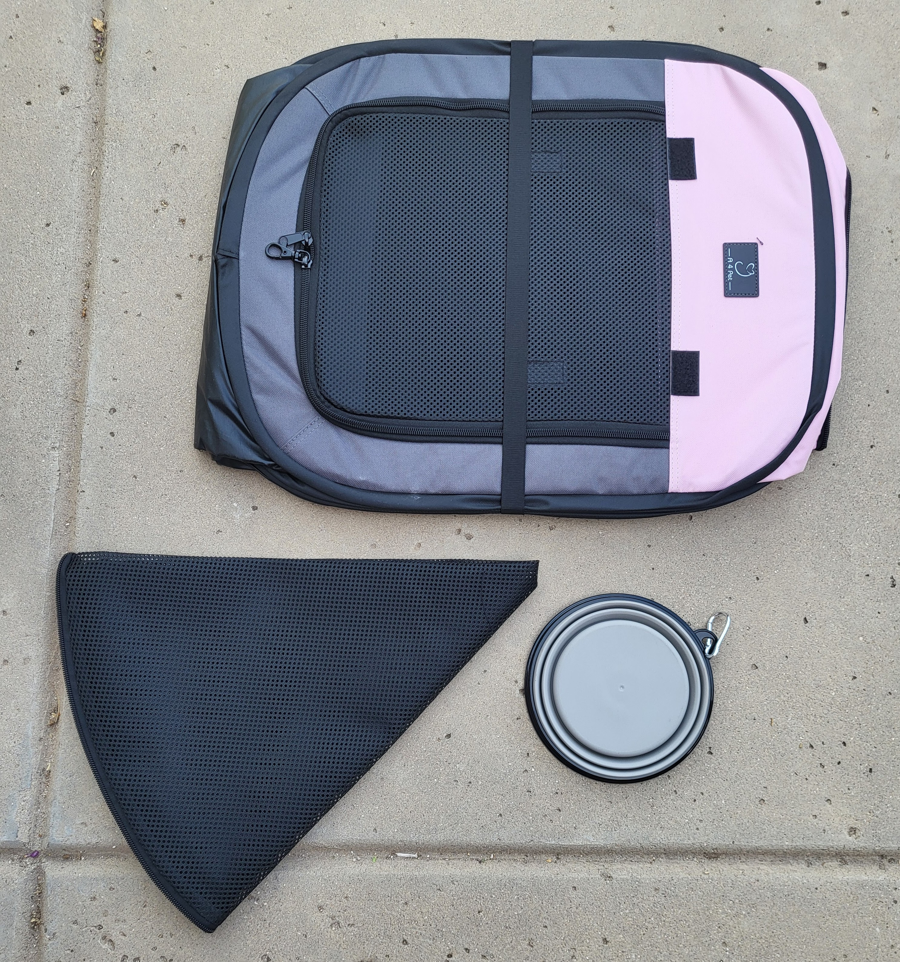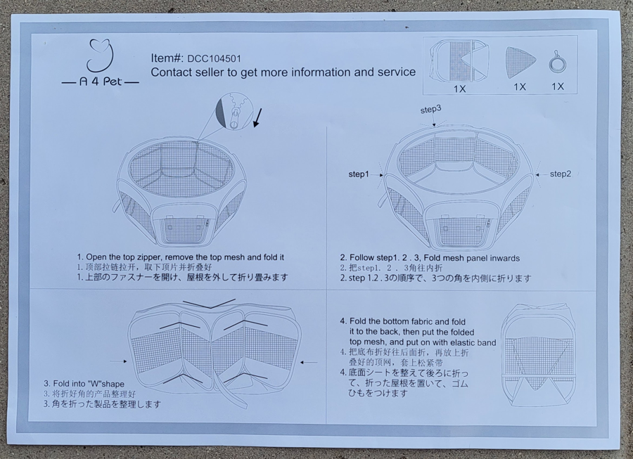 Made by A 4 Pet, this Indoor/Outdoor Playpen is Durable and Portable, with Foldable Design - Ideal for Puppies, Kittens, or other Small Animals. Removable Zipper Top and Collapsible Travel Bowl. New, in Original Packaging. Measures 49" x 49" x 24" when assembled.