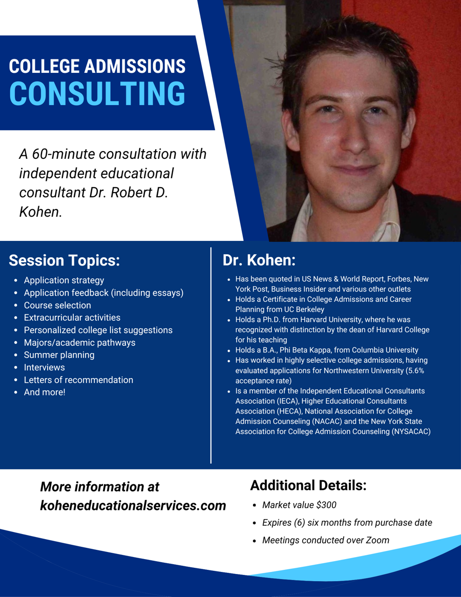 A 60-minute consultation with independent educational consultant Dr. Robert D. Kohen.