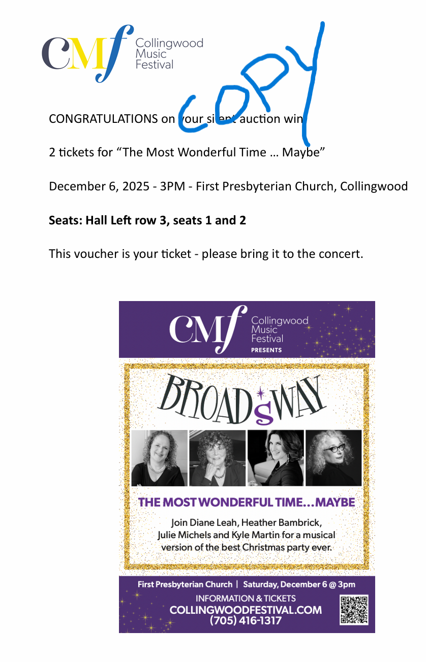 TERMS AND CONDITIONS "The Rotary Club of Collingwood-South Georgian Bay (“Rotary SGB”) thanks you for your support. By bidding on an auction item, you acknowledge and agree that Rotary SGB will not be liable for the failure or delay in the utilization of an auction item as a result of events or circumstances arising from COVID or any pandemic. Your winning bid with respect to an auction item is an agreement on your part to assume the risk that you may not be able to utilize the item as a result of COVID or pandemic restrictions and regulations ." There will be no refunds or returns. The winning bidder will be contacted for pickup. Photo ID required. PICKUP DATES: Nov 12 5-7pm & Nov 14 5-7pm CHECK BACK FOR LOCATION No shipping available.