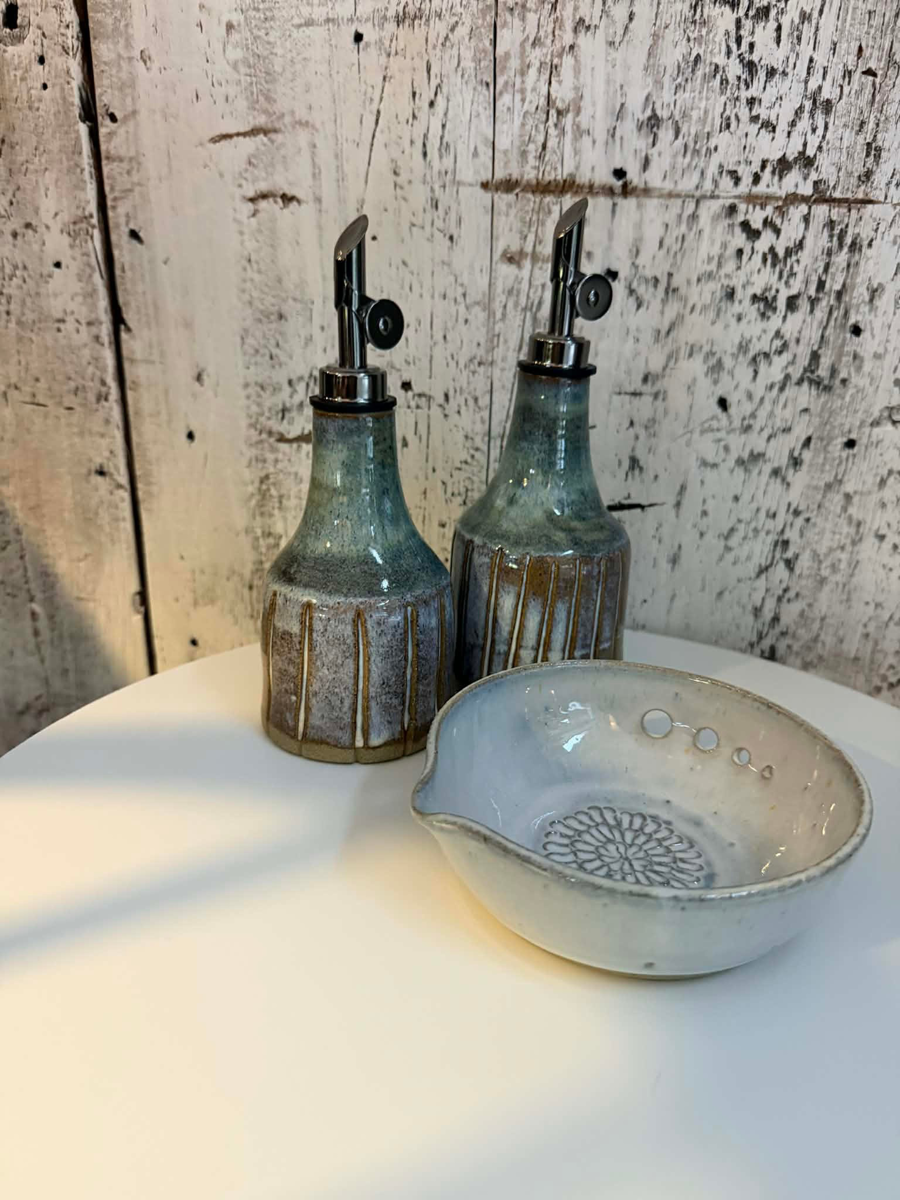 Collingwood Pottery - Set of oil and vinegar bottles as well as a garlic grater/herb stripper