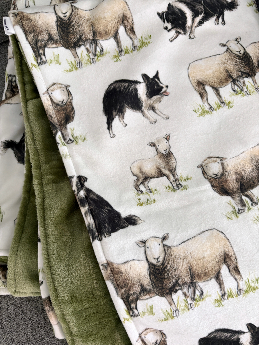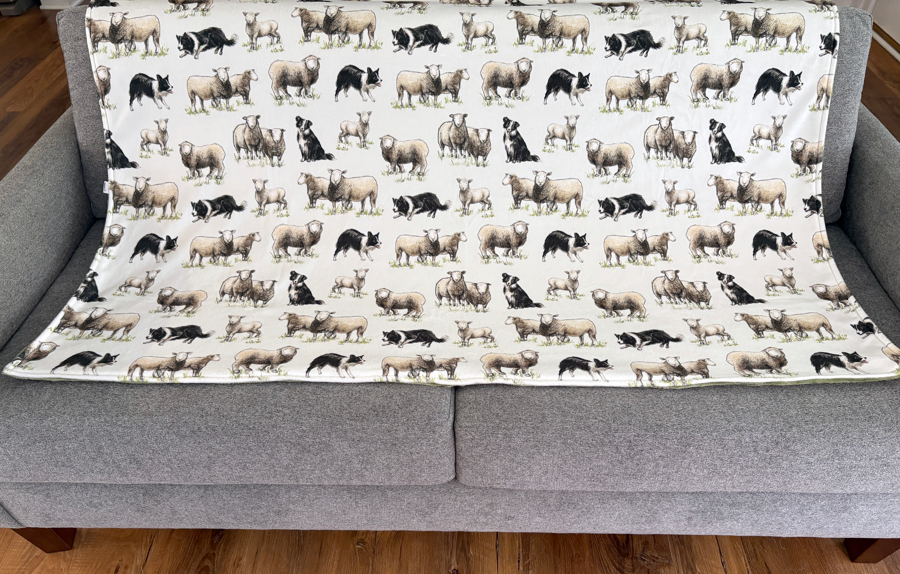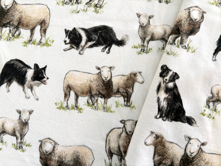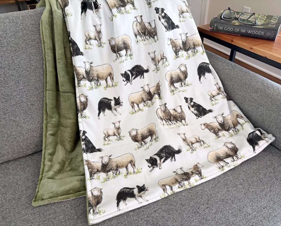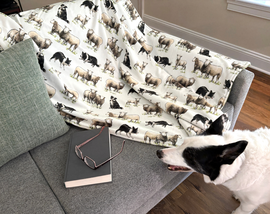 This comfy fleece lap quilt celebrates the lineage of herding dogs with charming rural farm scenes. The artists created these images on fabric reflecting the breed’s enduring legacy! Super soft fleece adds a luxurious cozy feel. Measures 57” long x 35” wide. Quilt reverses to a solid color whenever the mood or season strikes. 100% polyester, fully washable, easy to dry.
