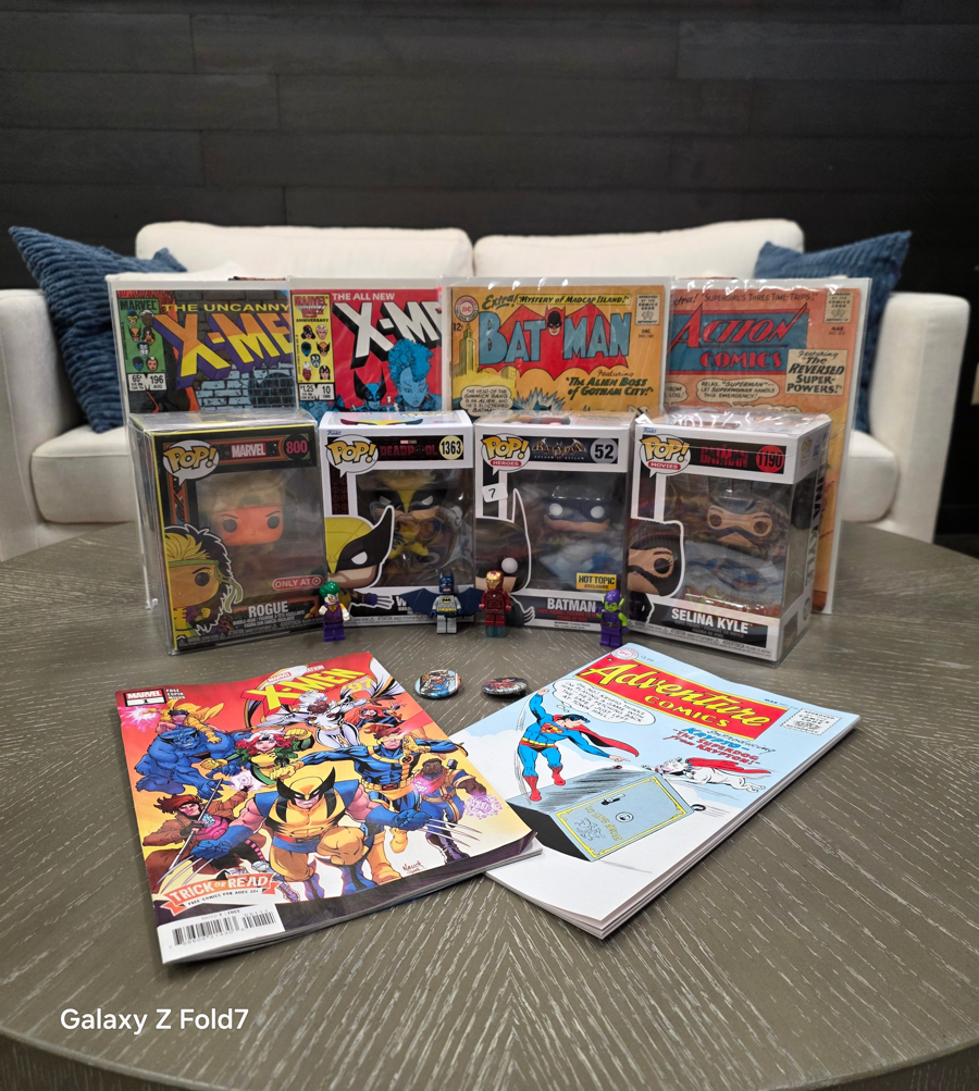 It’s the ultimate showdown of heroes and villains! This action-packed basket features POP figures of Rogue, Wolverine, Batman, and Selina Kyle, plus a collection of classic comic books — including Adventure Comics, X-Men, The Uncanny X-Men, Batman, and Action Comics. Top it off with Lego figurines to bring your favorite characters to life, and you’ve got a basket that’s sure to make any superhero fan say, “I need that!”