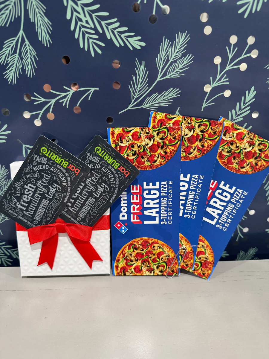 Enjoy 2 $20 Barburrito Gift Cards and 3 free large 3-topping Dominos Pizzas. Great for a busy family on the go or stocking stuffers! Donated by Barburrito and Dominos