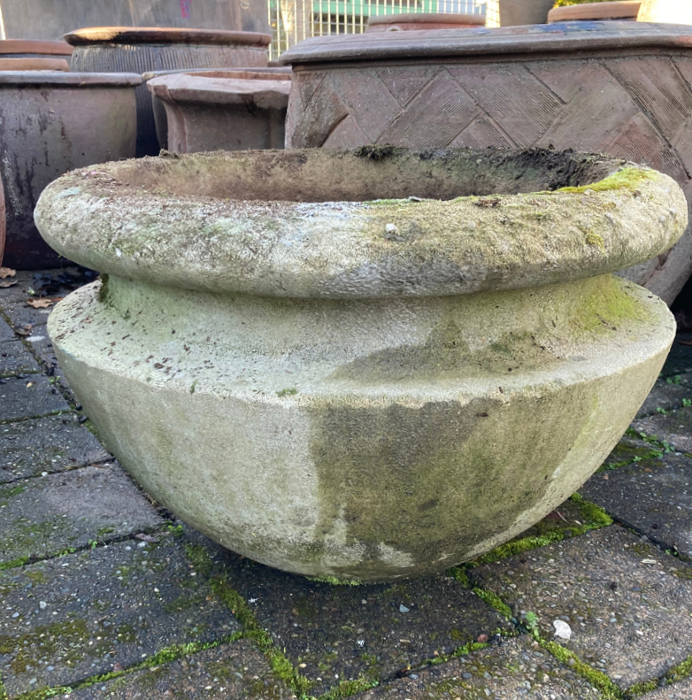 Rotund heavy walled concrete planter, lots of character from moss and lichen growth.
