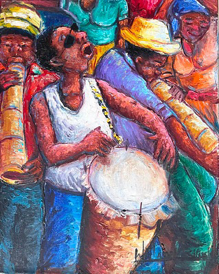This compelling painting invites you to a lively Haitian festival scene that is filled with music and joy. Dynamic brushstrokes and texture capture the motion of the people and amplify the vibrant energy.
