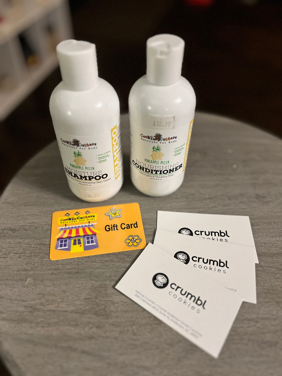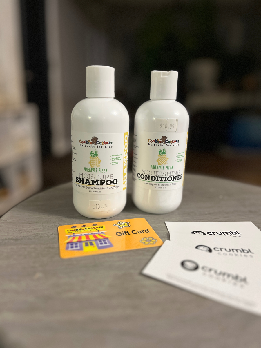 A haircut, and a treat! Give your little one a fun haircut experience at Cookie Cutters, complete with a shampoo and conditioner to take home, then head to Crumbl! Each Crumbl card is good for one cookie.