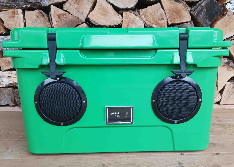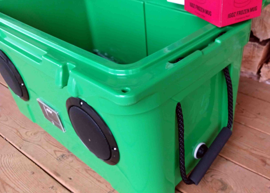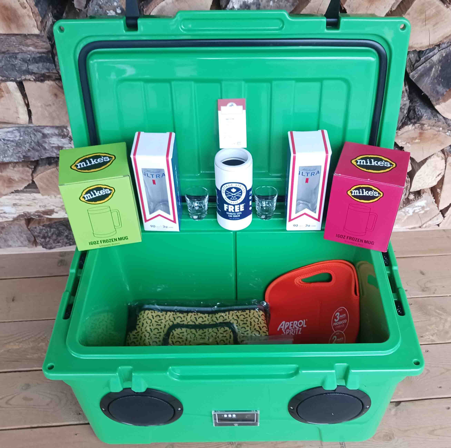 45 L "Sober Carpenter" insulated cooler with built-in, water-resistant Bluetooth speakers. Retains ice for 3-4 days! Heavy Duty Rope Handles and Rubber Latches for a secure close. Built-in rechargeable Li-ion battery. USB charging cord and manual included. Keep your food and beverages cold while also providing music for outdoor activities and gatherings! Filled with party favourites to get the fun started! Includes: Green cooler with built-in radio, 2 speakers and a drain plug. 2 tall glasses 2 Mike's cooler mugs 1 insulated can cooler 2 shot glasses 1 Mike's Bag 1 Insulated bottle carrier for 2 bottles 2 Dixon lanyards
